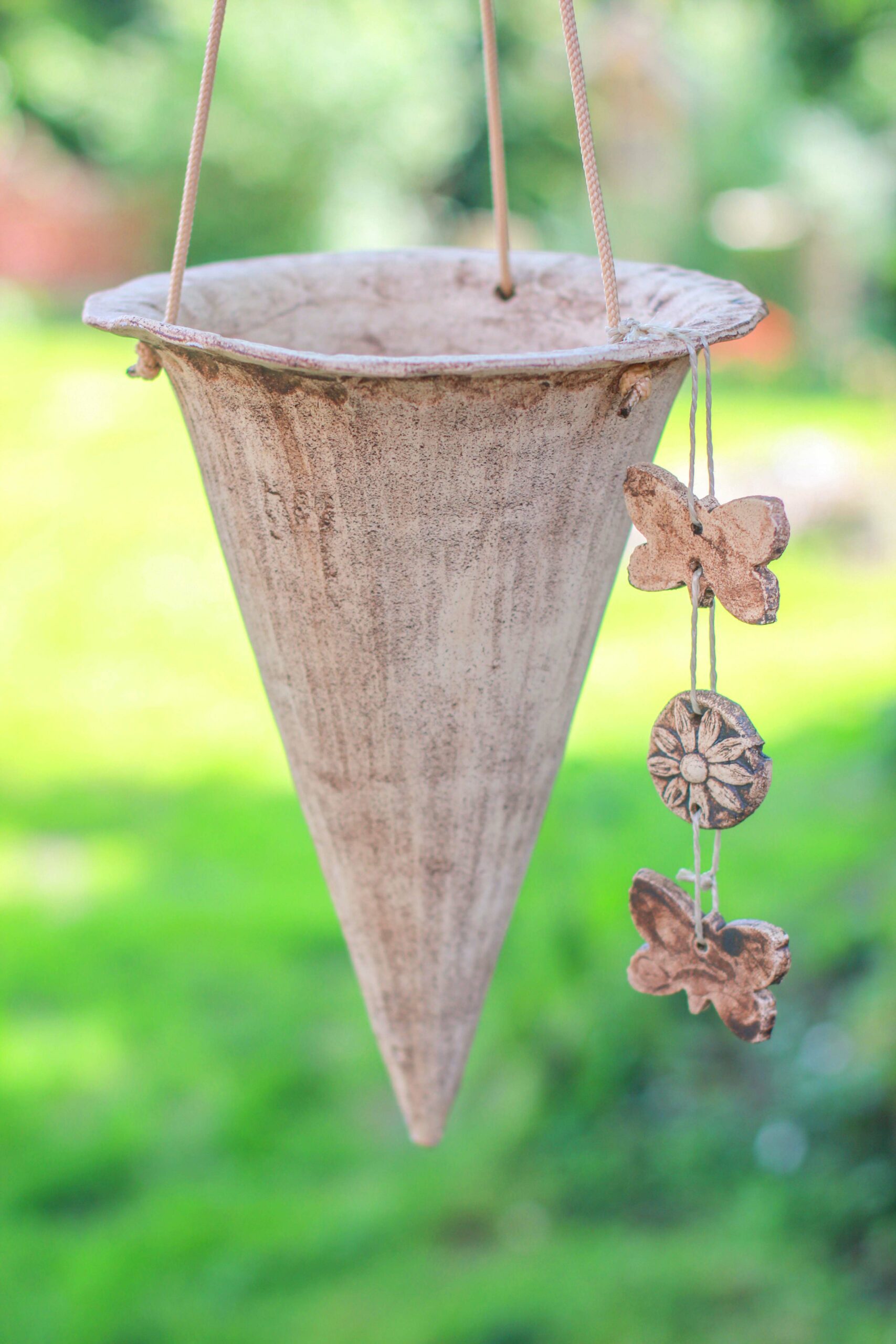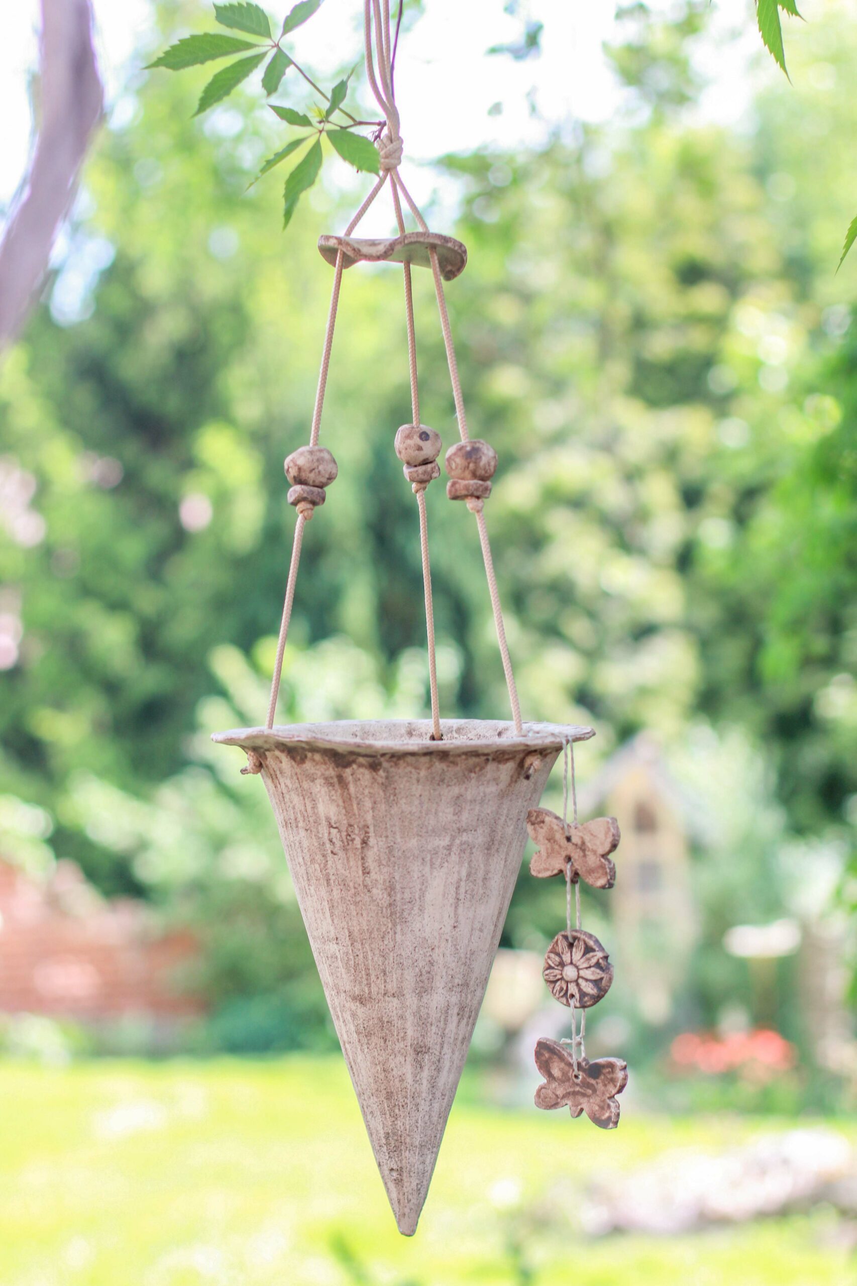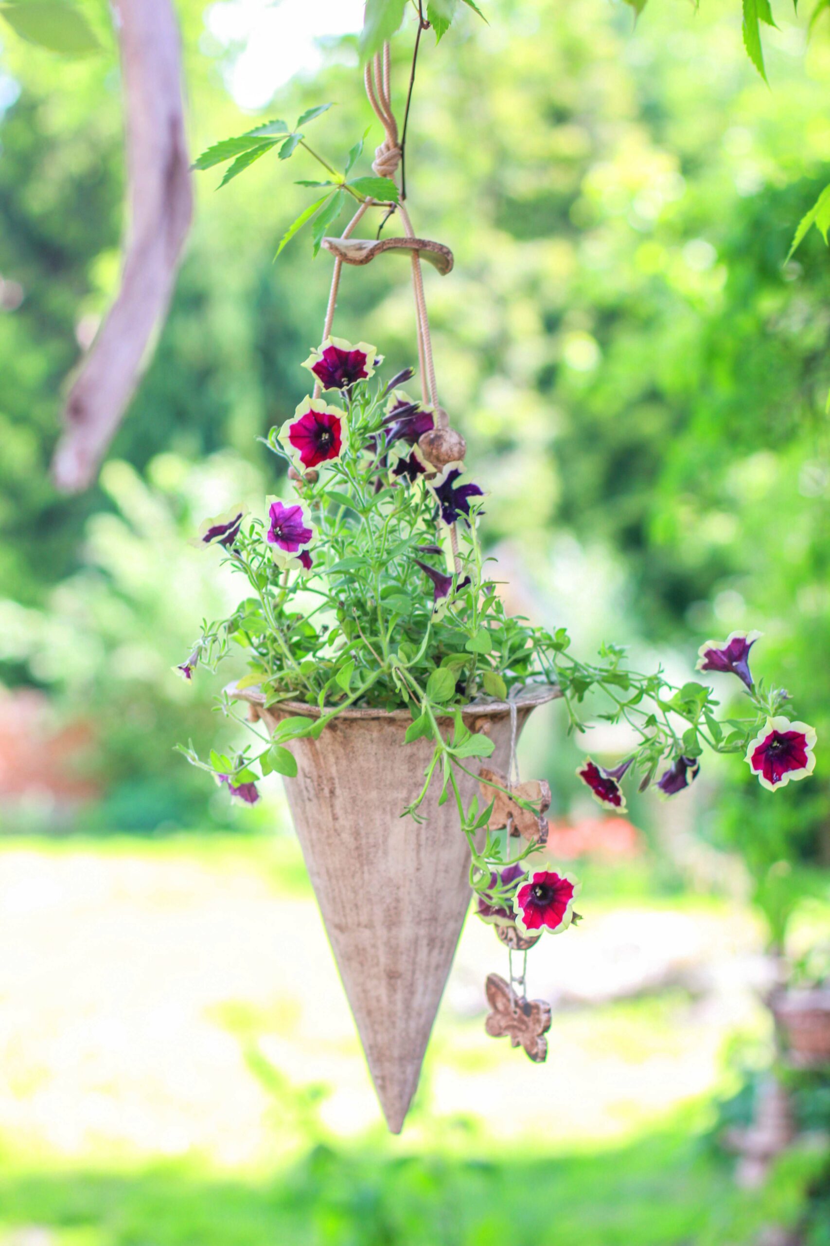 Blumenampel in Form einer Eistüte. Alle meine Hängeampeln haben unten ein Ablaufloch damit sie direkt bepflanzt werden können.