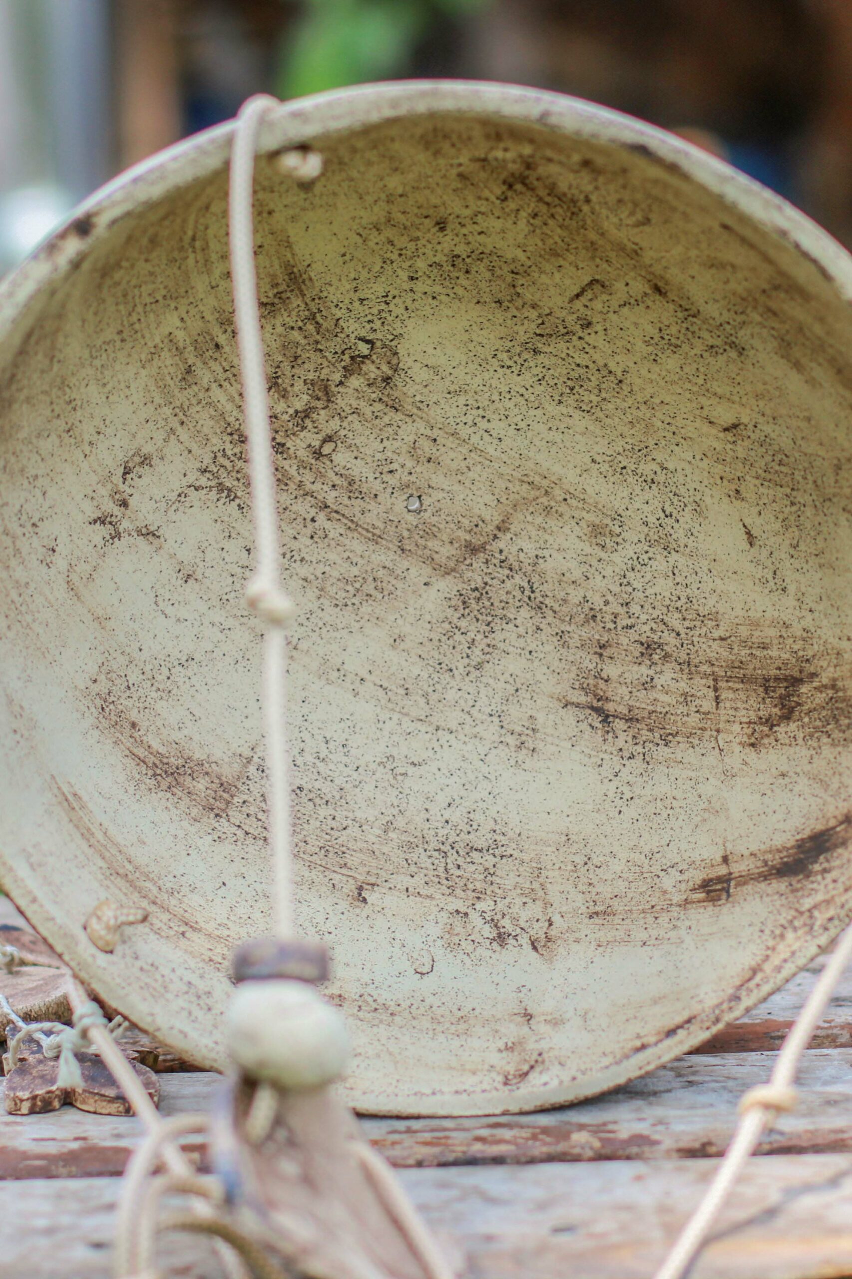 Meine verwendeten Schnüre zum Aufhängen sind aus Kunststoff mit einem starken Kunststoffkern. Bei mir hängen die Keramiken seit 9 Jahren mit den ersten Schnüren. Sie werden irgendwann weiß, grau, grün…sie halten trotzdem.