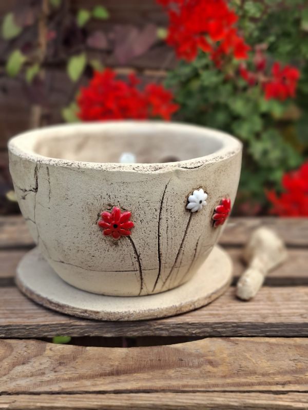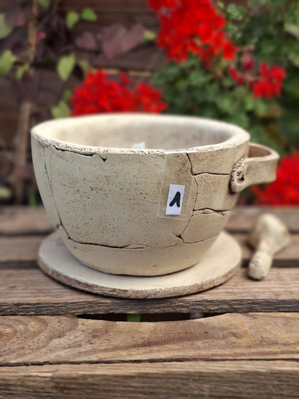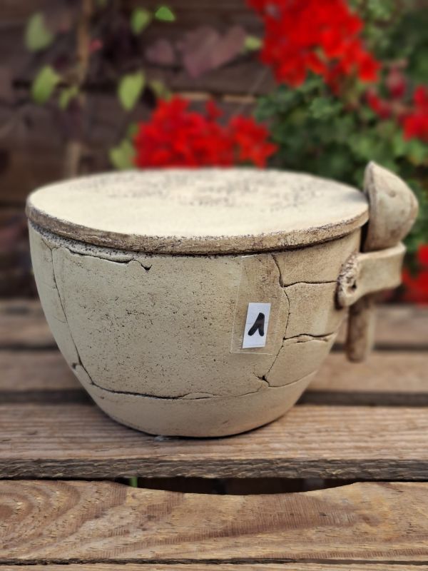 Gartenfackel für Kerzenreste in liebevoller Handarbeit gefertigt mit Glasfaserdocht Durchmesser: ca. 14 cm Höhe: ca. 8 cm Material: Ton weiß mit Keramiklöffel zum Löschen.
