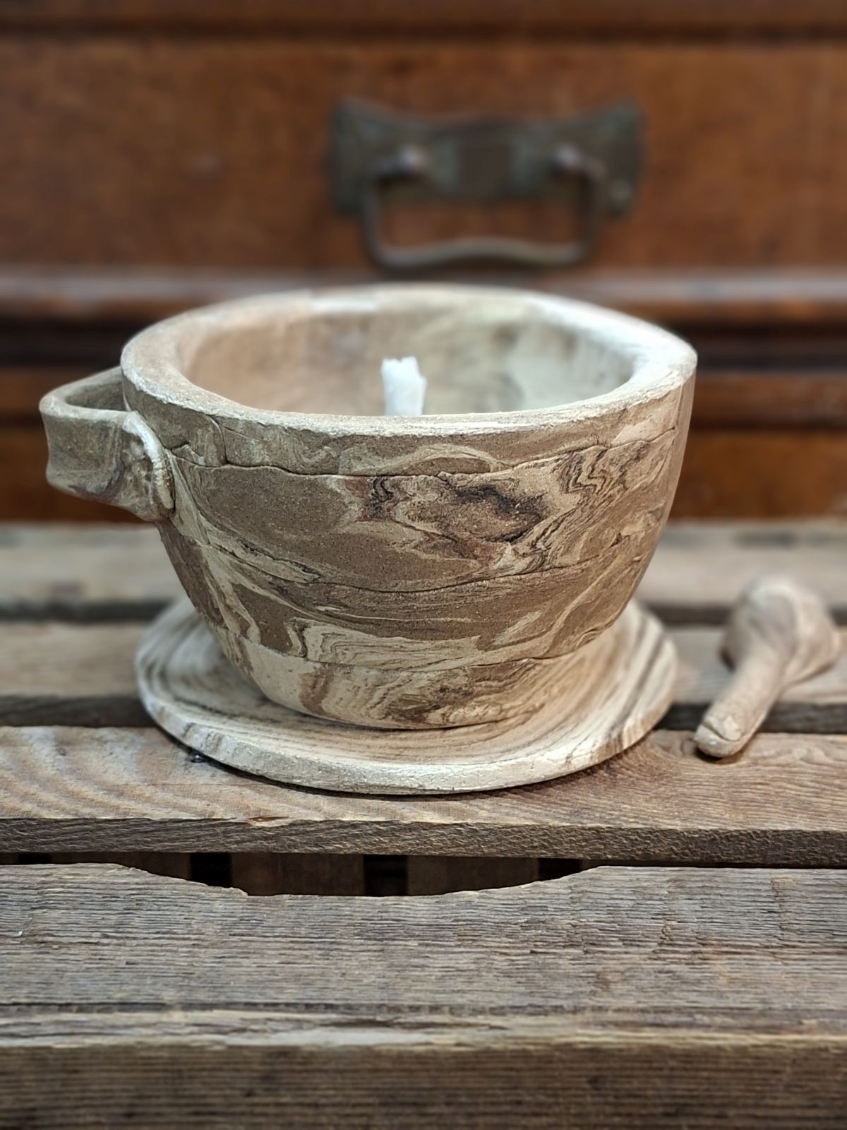 Gartenfackel für Kerzenreste in liebevoller Handarbeit gefertigt mit einem Glasfaserdocht. Durchmesser: ca. 14 cm Höhe: ca. 8 cm Material: Ton dreifarbig mit Keramiklöffel zum Löschen.