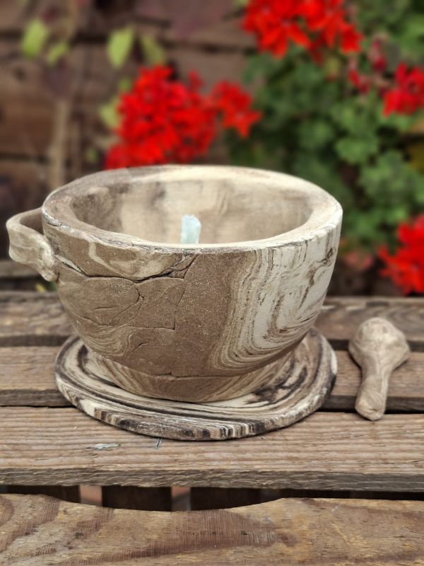 Gartenfackel für Kerzenreste in liebevoller Handarbeit gefertigt mit einem Glasfaserdocht. Durchmesser: ca. 14 cm Höhe: ca. 8 cm Material: Ton dreifarbig mit Keramiklöffel zum Löschen.