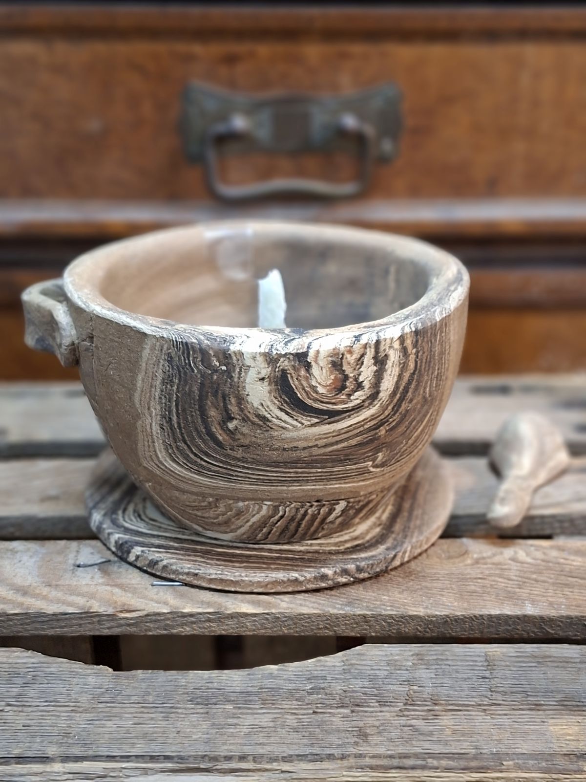 Gartenfackel für Kerzenreste in liebevoller Handarbeit gefertigt mit einem Glasfaserdocht. Durchmesser: ca. 14 cm Höhe: ca. 8 cm Material: Ton dreifarbig mit Keramiklöffel zum Löschen.