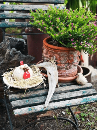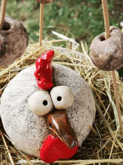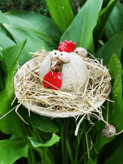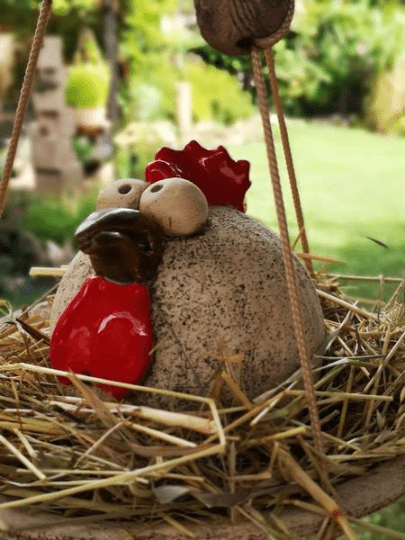 Kleine Junghenne zum hängen oder auf einen Stab zu stecken. Henriette kann man auch mit Meisenknödeln bestücken im Winter. Im Nest sind drei Löcher damit das Wasser nicht darin steht. Dort kann man Drähte durchstecken und Meisenknödel dran hängen.