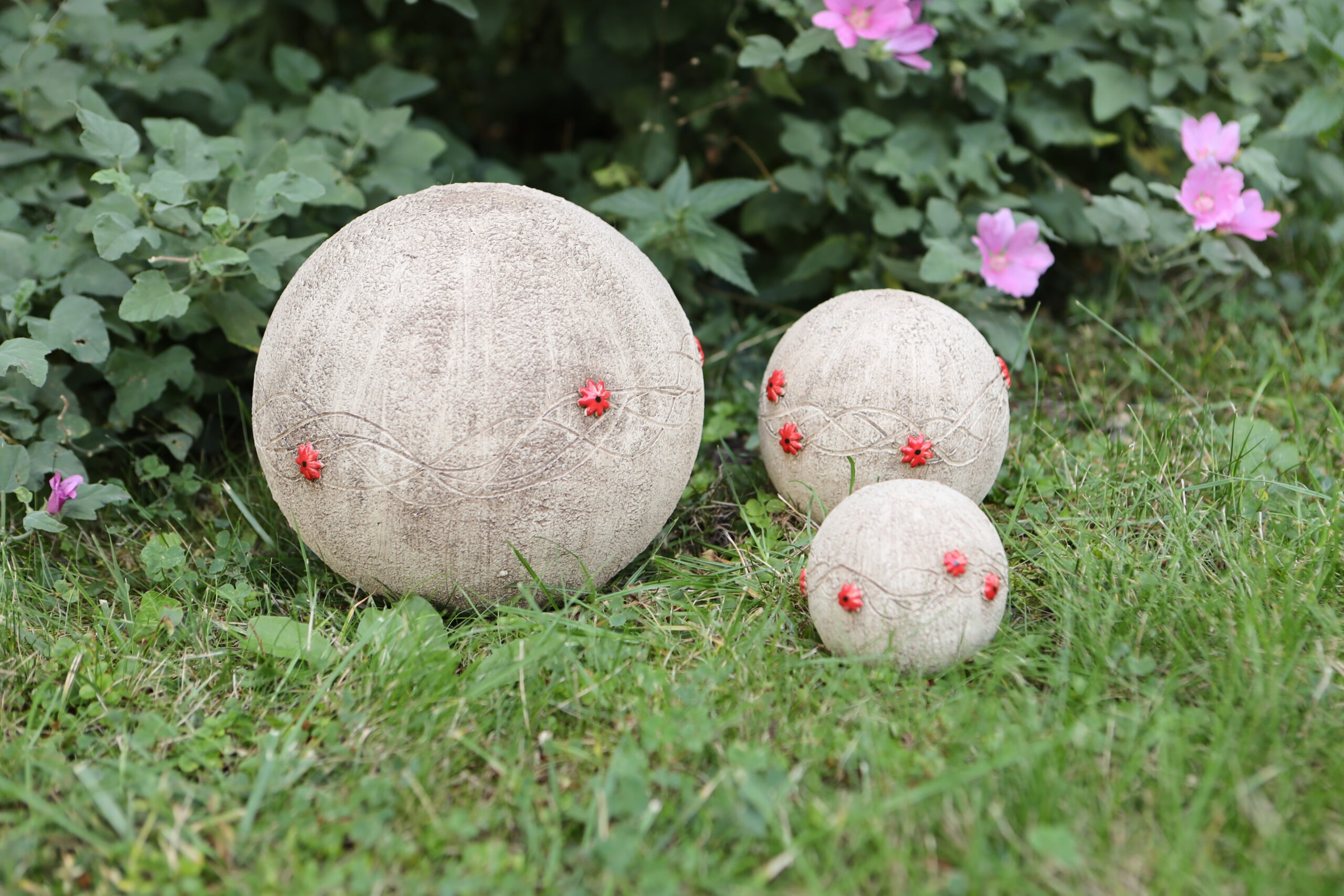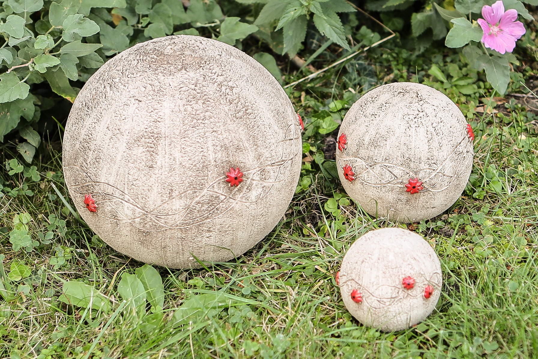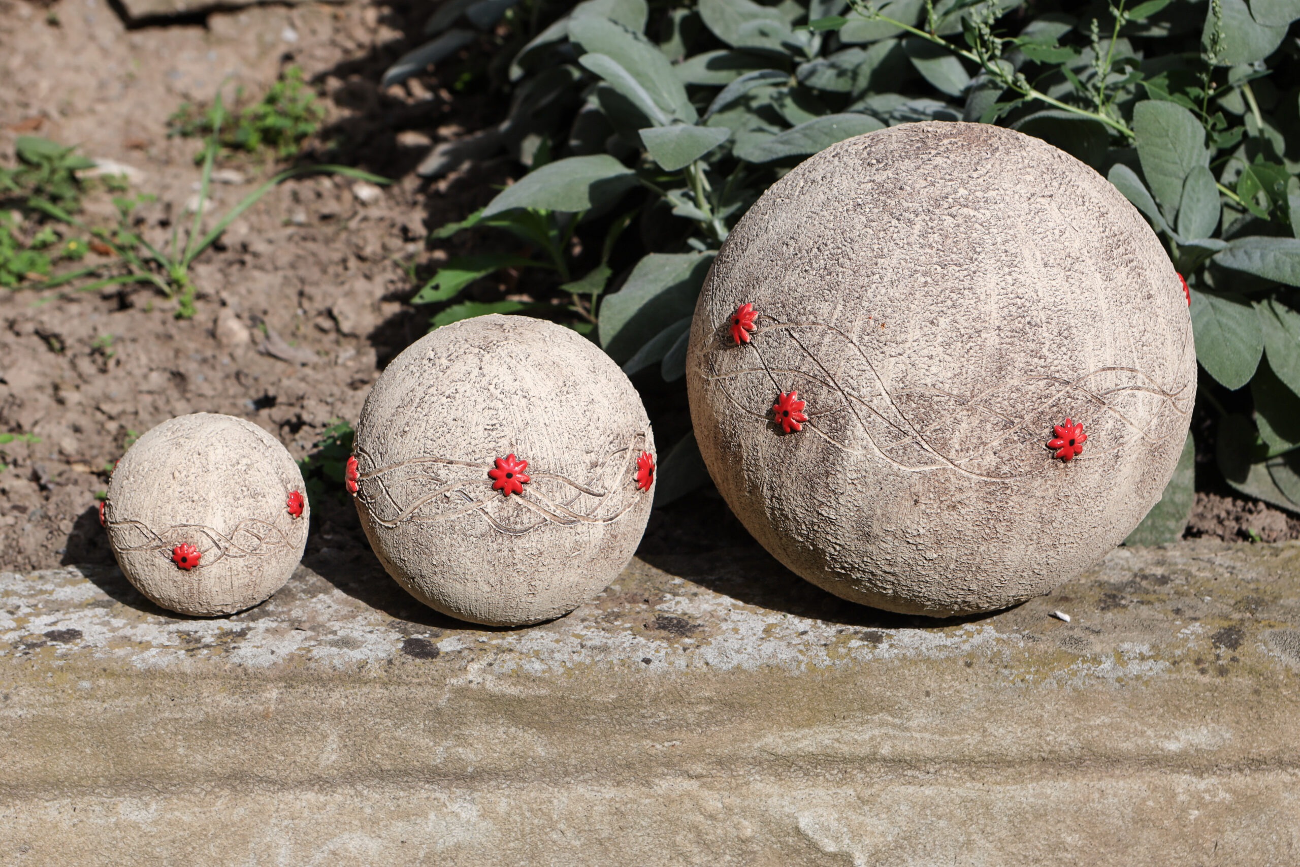 Wunderschönes Gartenkugelset mit einer Ranke aus roten Margeriten. Man kann sie schön im Garten dekorieren oder auch auf einem Stab ins Beet stecken. Unverwüstlich, etwas von dem man ein Leben lang etwas hat. Natürlich sind sie, wie alle meine Sachen frostfest gebrannt und somit auch im Winter ein absoluter Hingucker.