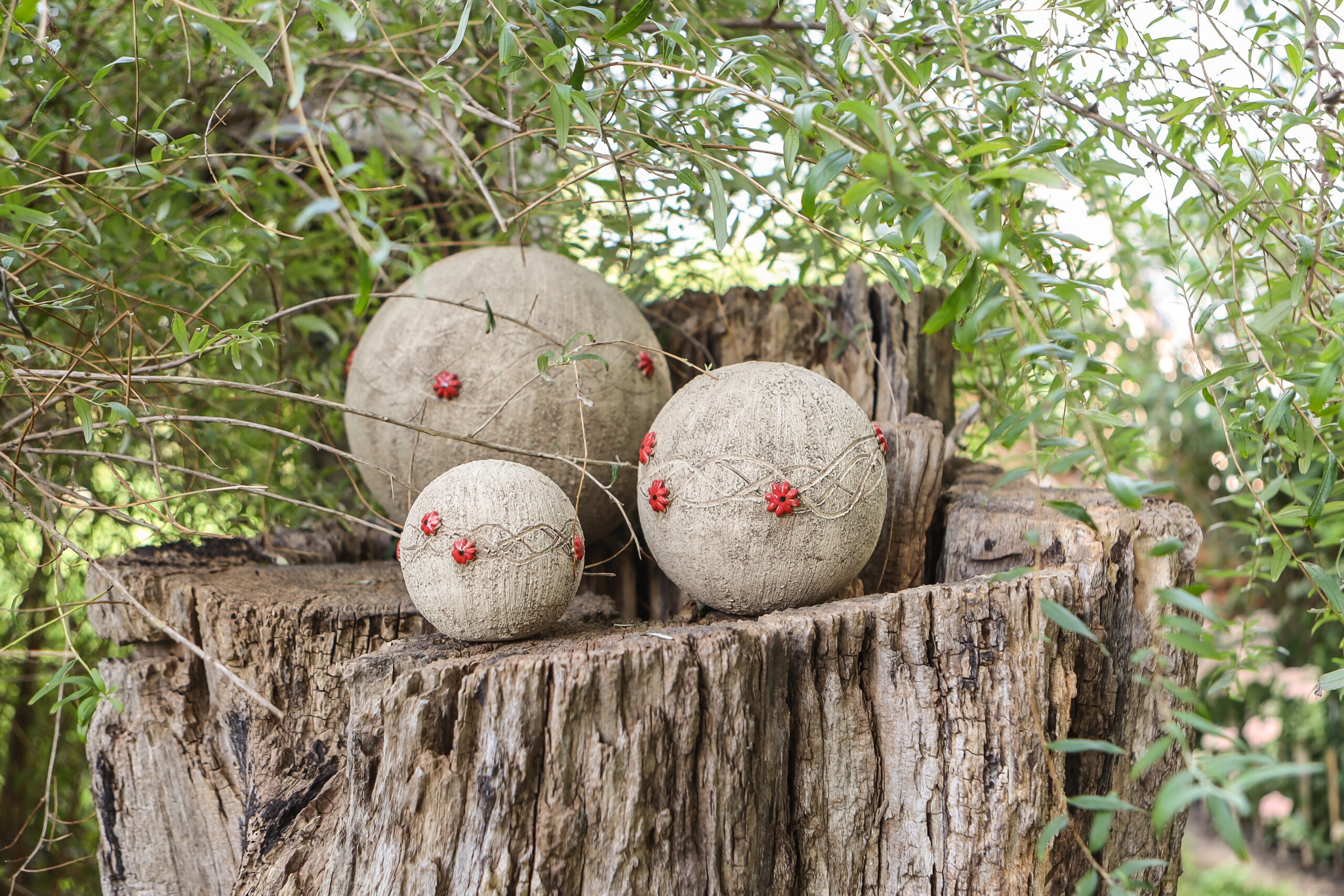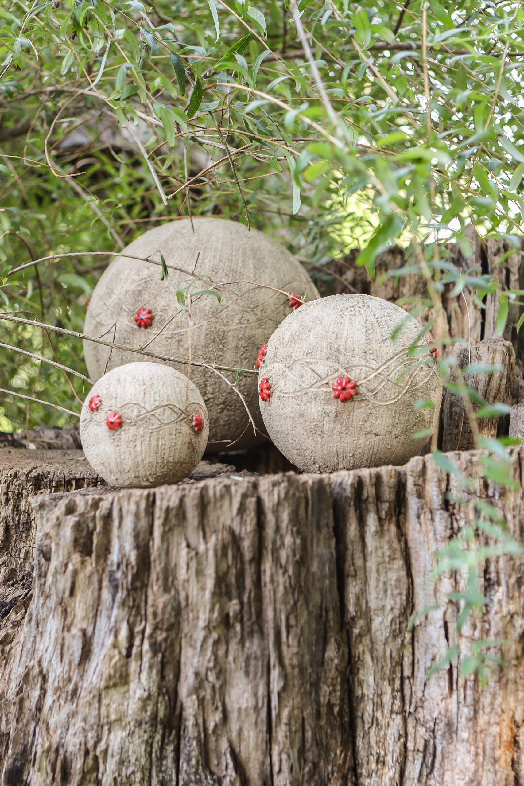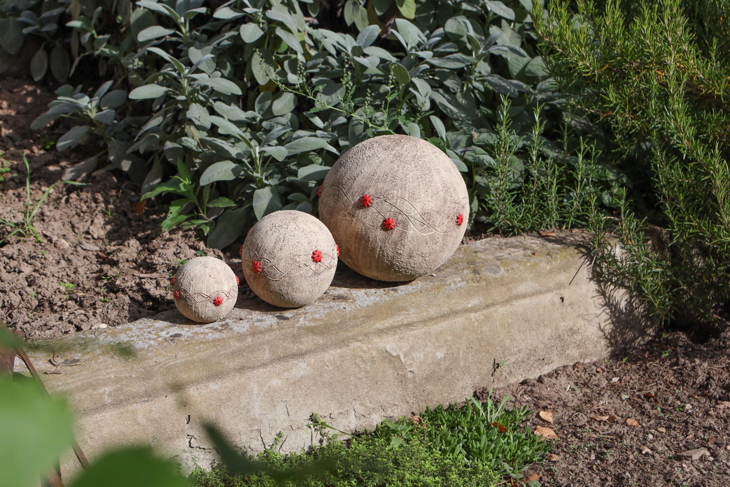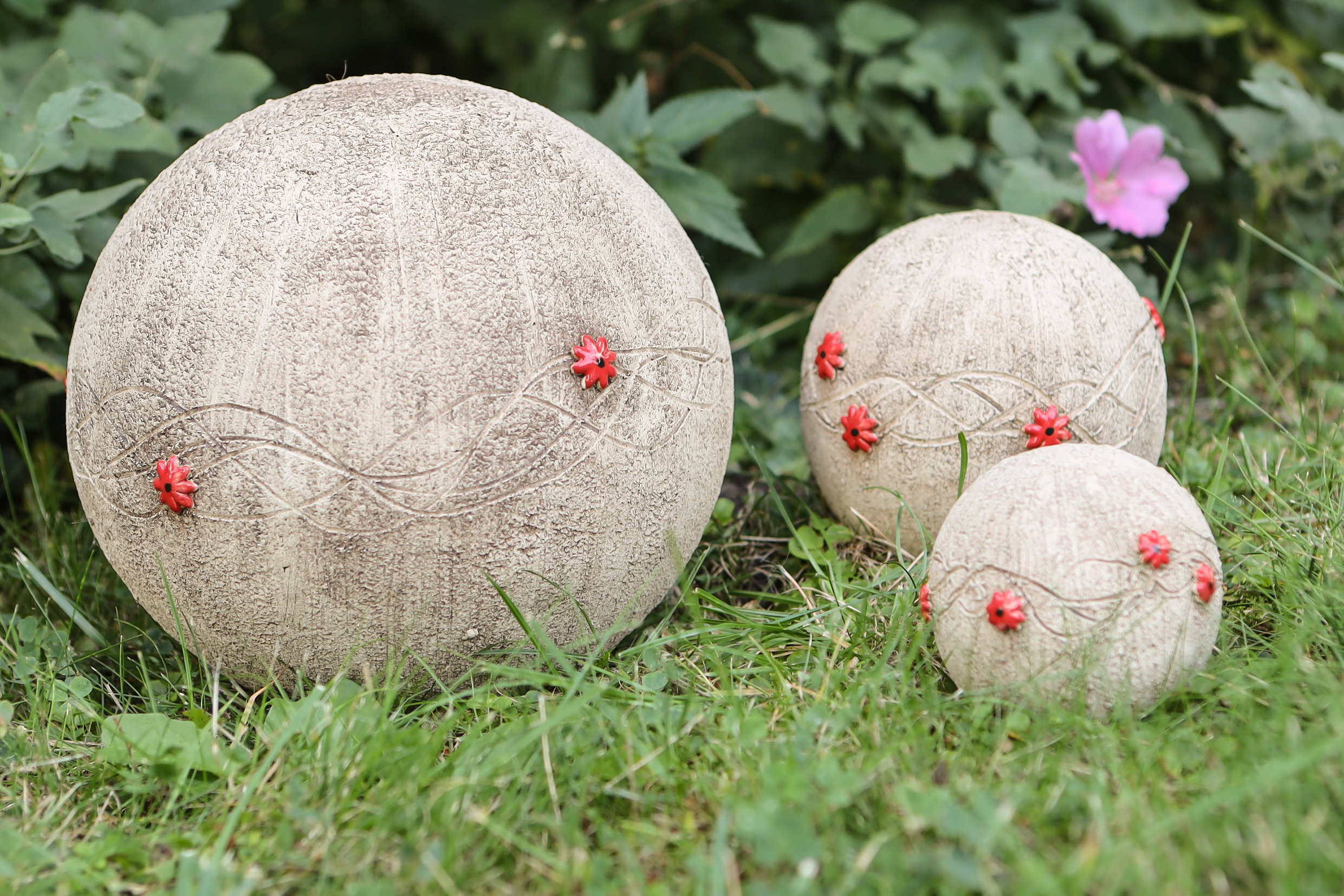 Wunderschönes Gartenkugelset mit einer Ranke aus roten Margeriten. Man kann sie schön im Garten dekorieren oder auch auf einem Stab ins Beet stecken. Unverwüstlich, etwas von dem man ein Leben lang etwas hat. Natürlich sind sie, wie alle meine Sachen frostfest gebrannt und somit auch im Winter ein absoluter Hingucker.