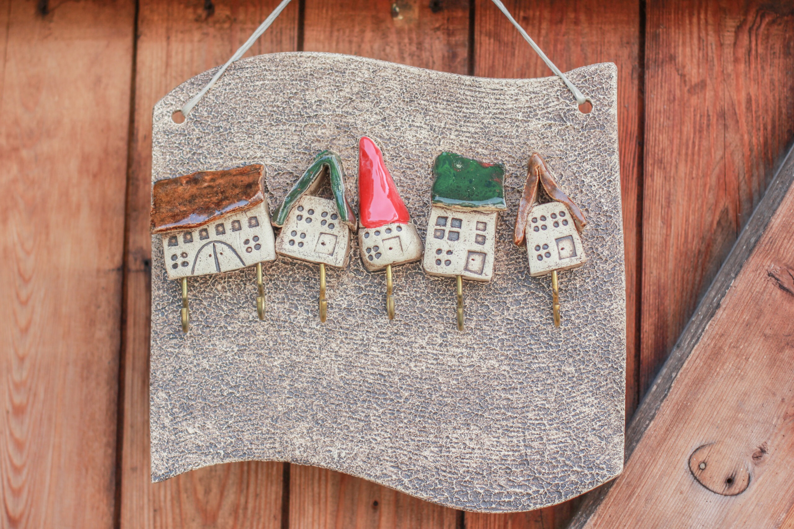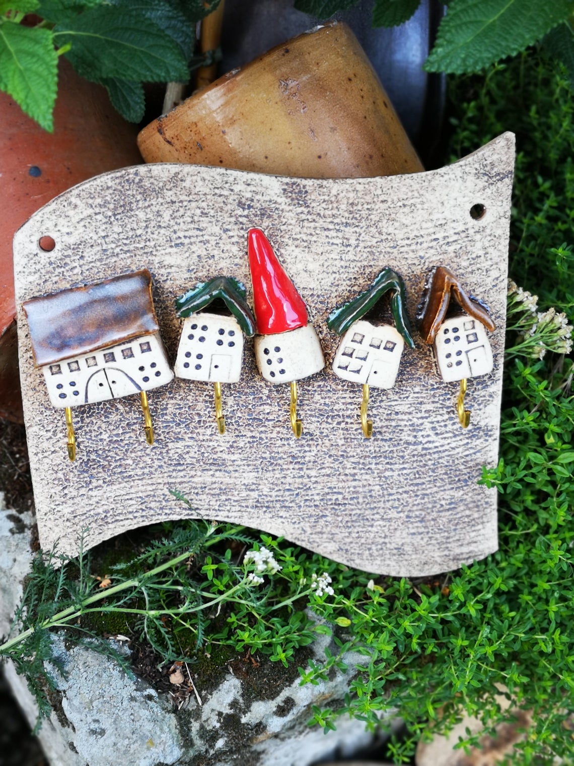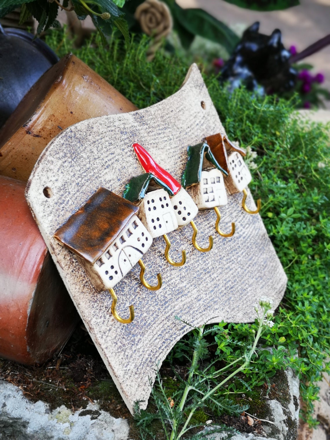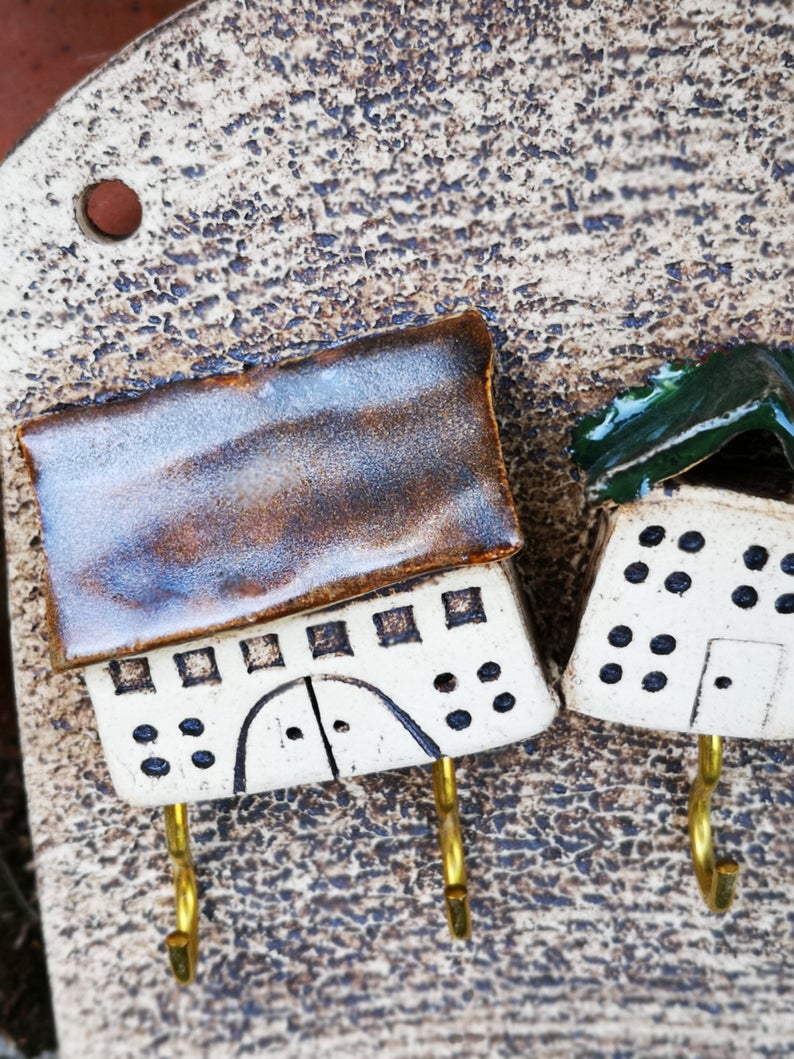 Robustes und langlebiges Schlüsselbrett aus Keramik. Hübsch und nützlich, eine bessere Kombination gibt es wohl kaum. Sechs Messinghaken sind unterhalb in die Häuser geklebt.