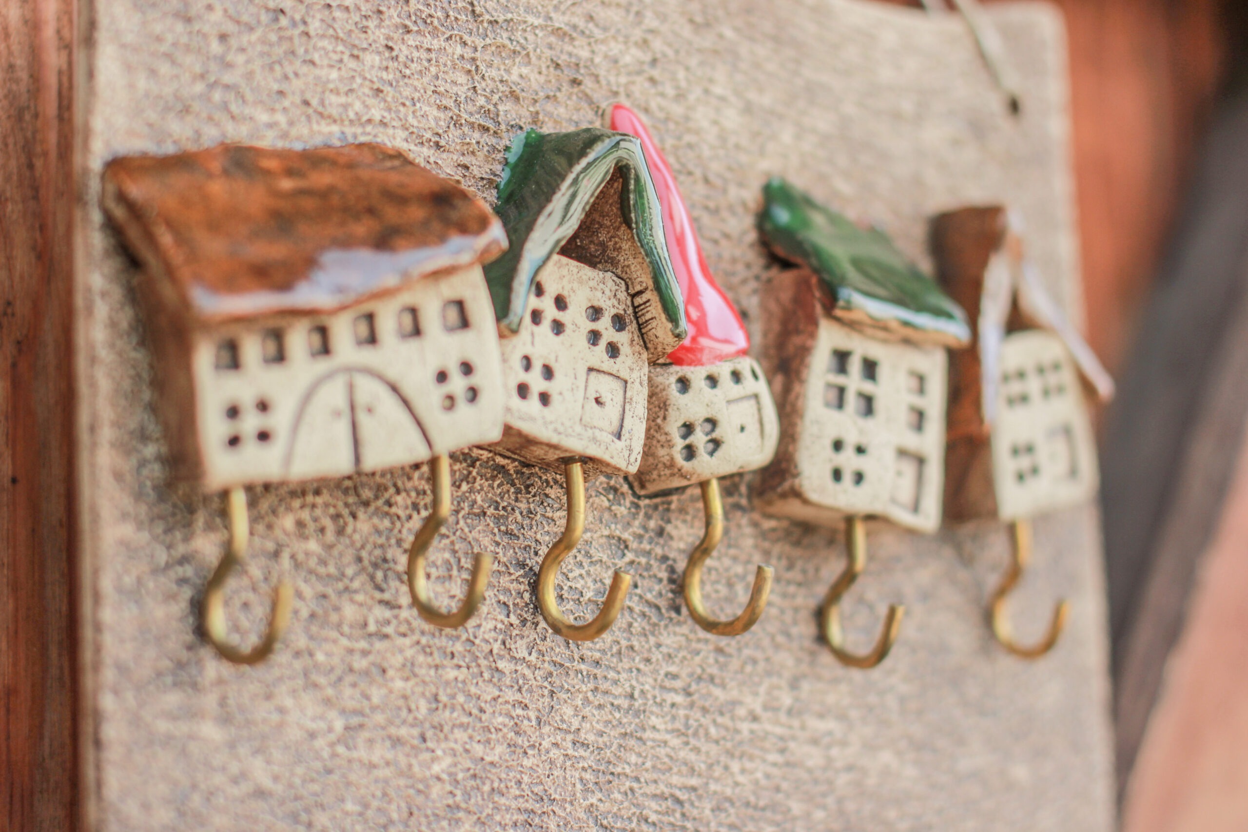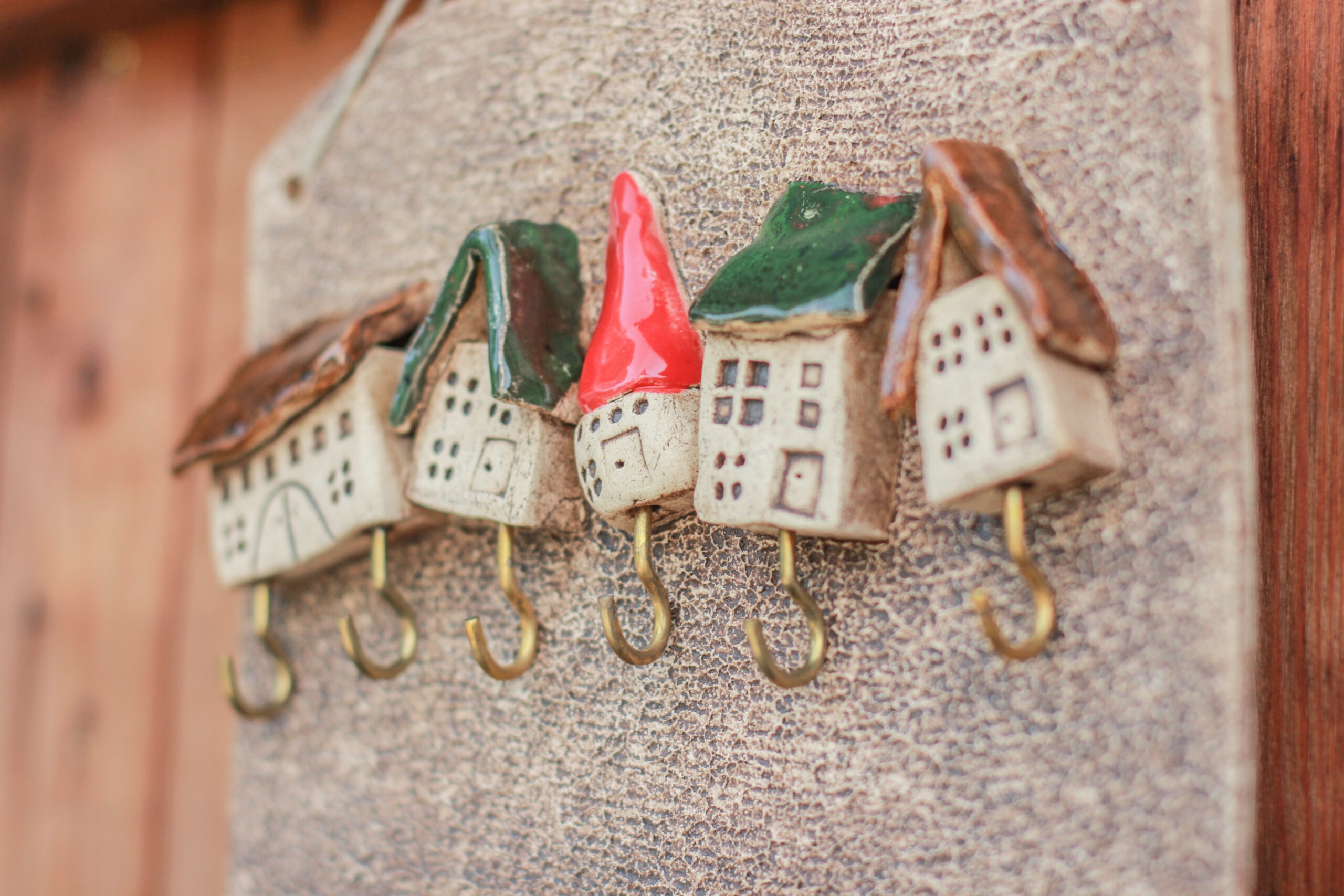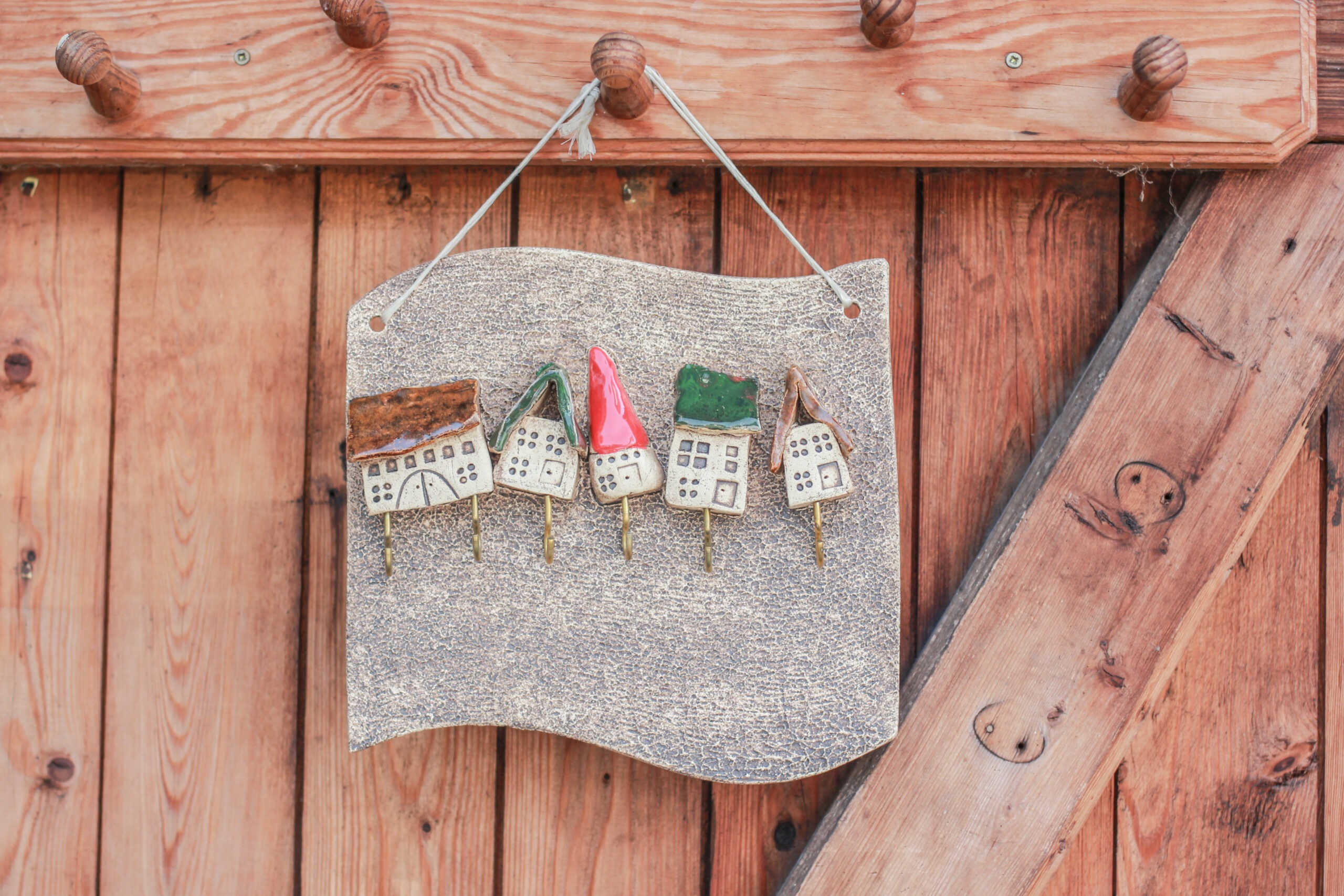 Robustes und langlebiges Schlüsselbrett aus Keramik. Hübsch und nützlich, eine bessere Kombination gibt es wohl kaum. Sechs Messinghaken sind unterhalb in die Häuser geklebt.