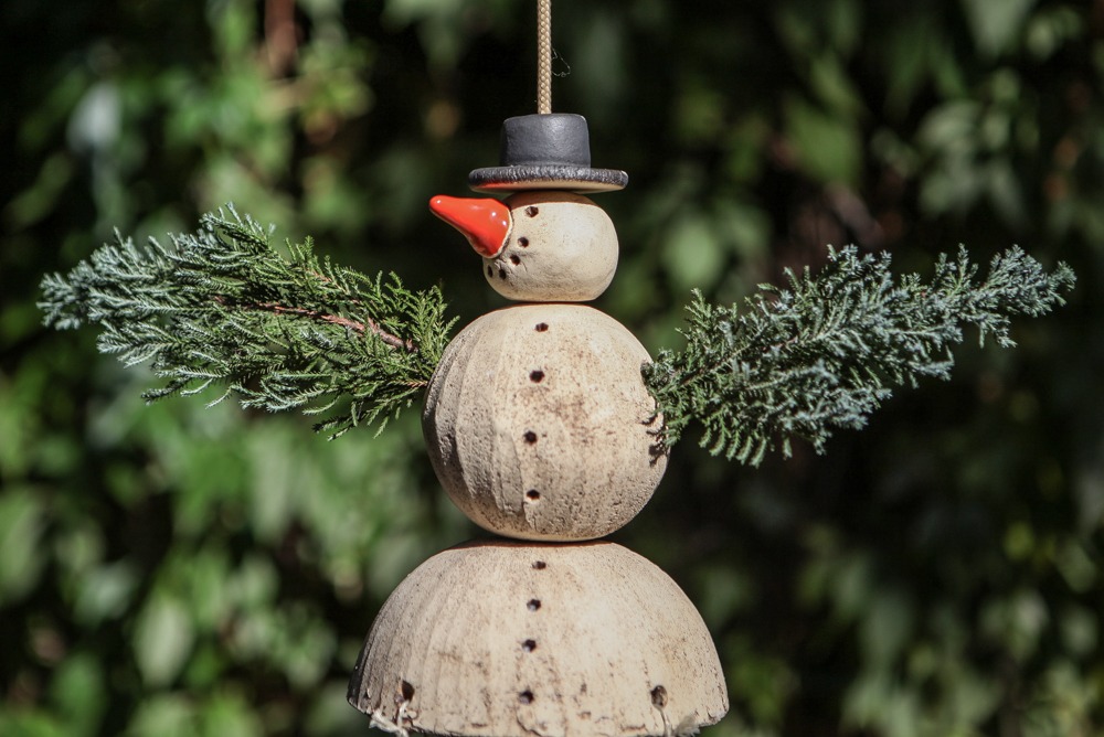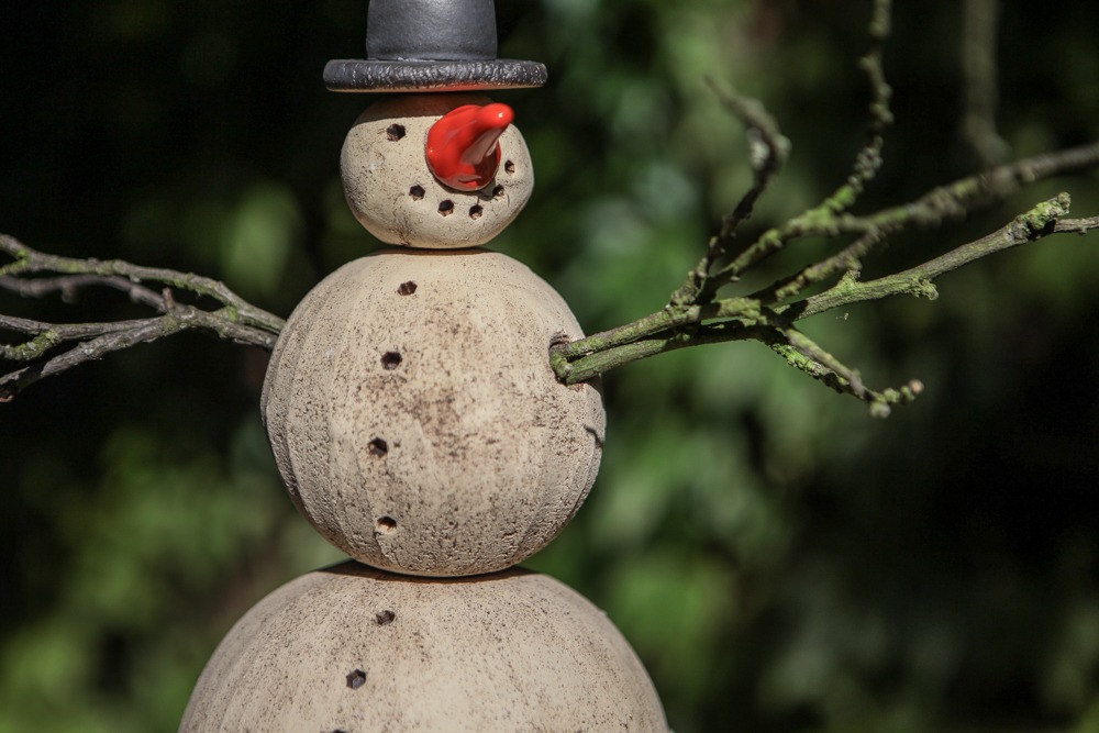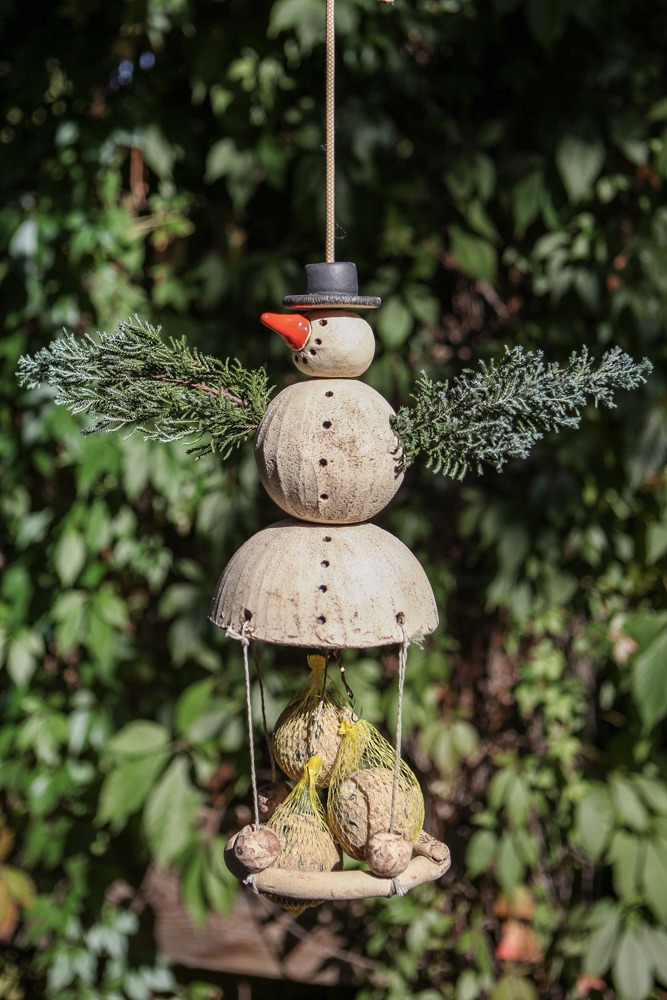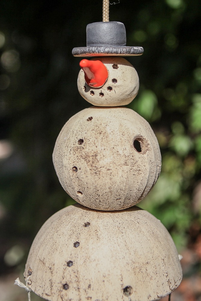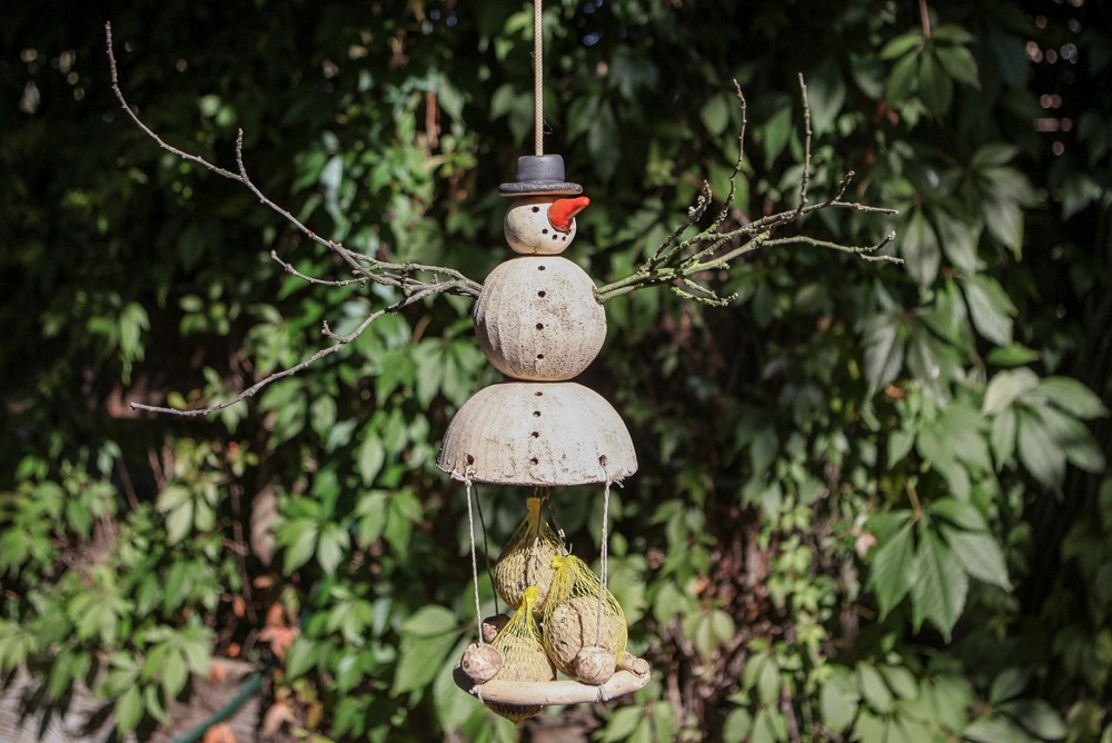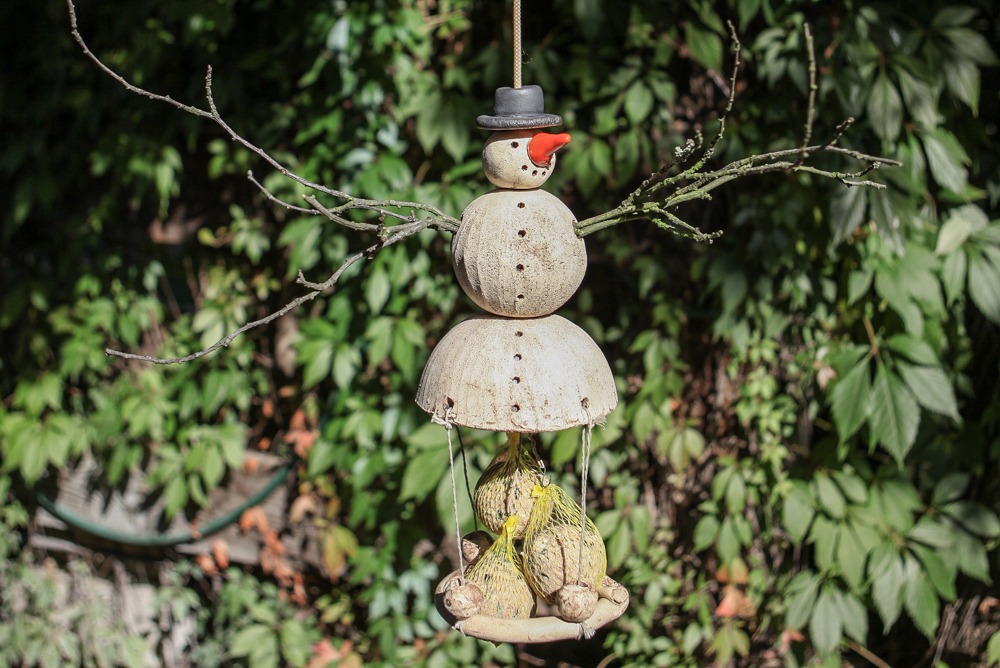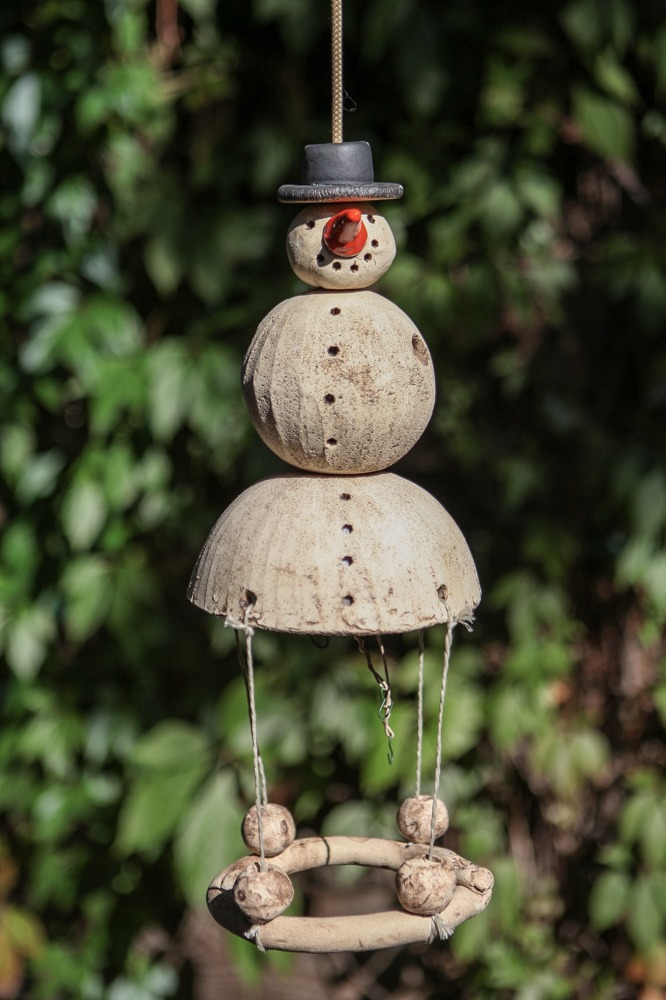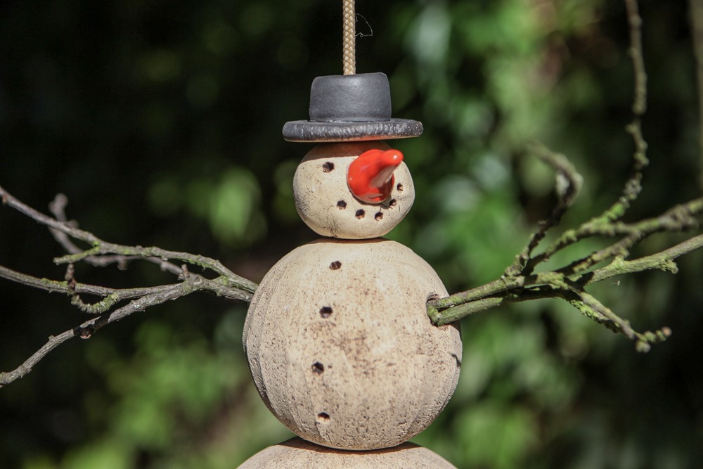Schneemann Peter ist ein Meisenknödelhalter mit runder Landeplattform aus Keramik. Sehr hübsch und sehr beliebt bei den Piepsern. Unten in der Glocke sind drei Drähte für drei Meisenknödel befestigt, an den Drähten sind Haken zum anhängen der Meisenknödel.