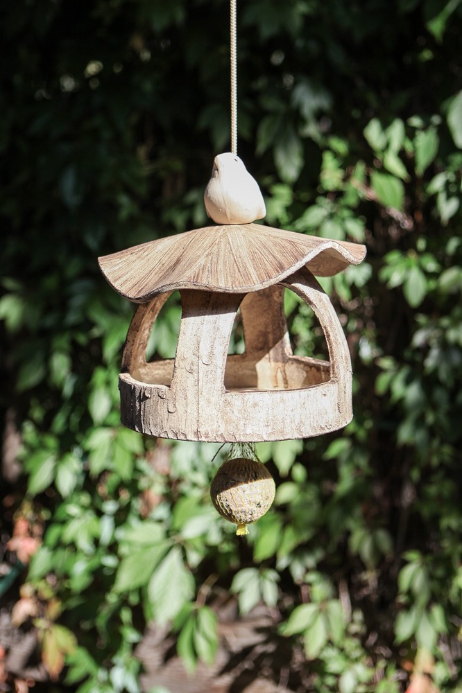 Diese Vogelhäuschen aus Keramik ist ein Eyecatcher in jedem Garten. In liebevoller Handarbeit in der eigenen Werkstatt gefertigt, ist dieses Häuschen eine Bereicherung für jeden Garten. Mit seinen geschwungenen Linien erinnert es in seiner Form an einen Pilz. Gekrönt wird das Vogelhaus durch einen detailreich gestalteten Tonvogel. Aus weißbrennendem Steinzeugton gefertigt, sieht dieses Häuschen nicht nur gut aus, sondern ist auch robust und langlebig.