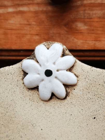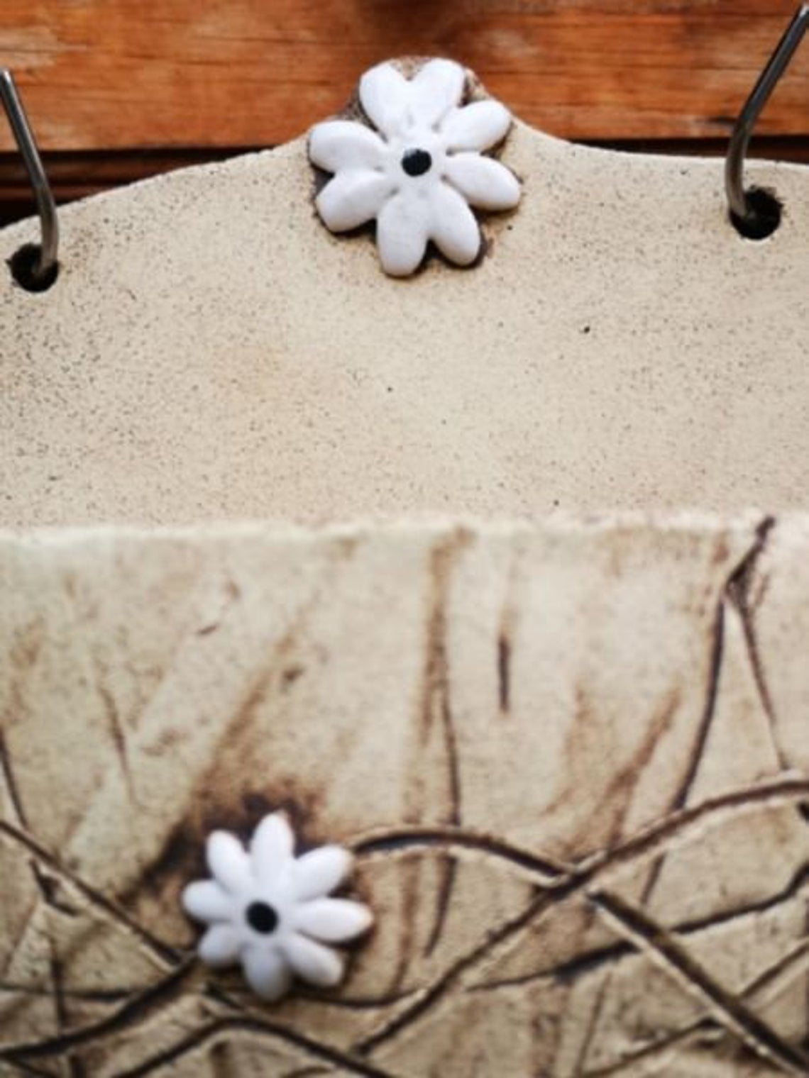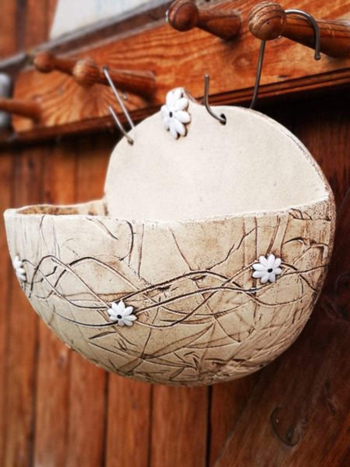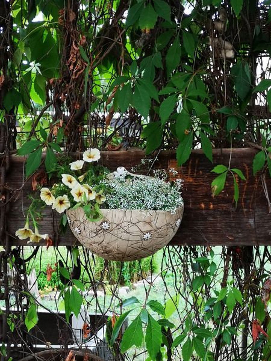 Pflanzschale für die Wand oder den Gartenzaun. Romantisch umrankt mit kleinen weißen Margeriten.